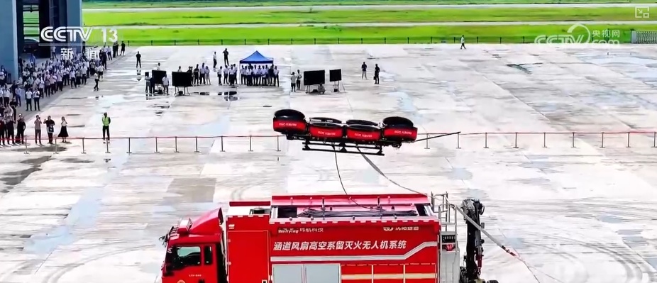 无人机企业技术保障经理唐海丰介绍,这是全球首款采用涵道电动风扇推进技术设计的高空消防灭火无人机,具有更大的推力,载荷达到400公斤,爬升至百米高空仅需不到1分钟,很好解决了城市高空消防难题。